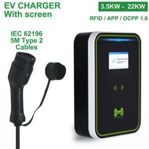 This wall-mounted ev charger is suitable for home charging. It is easy to install, stable and has a complete protection mechanism. The display shows real-time charging data. The charger can also be used in conjunction with a stand for installation in the garden or in an outdoor parking space.